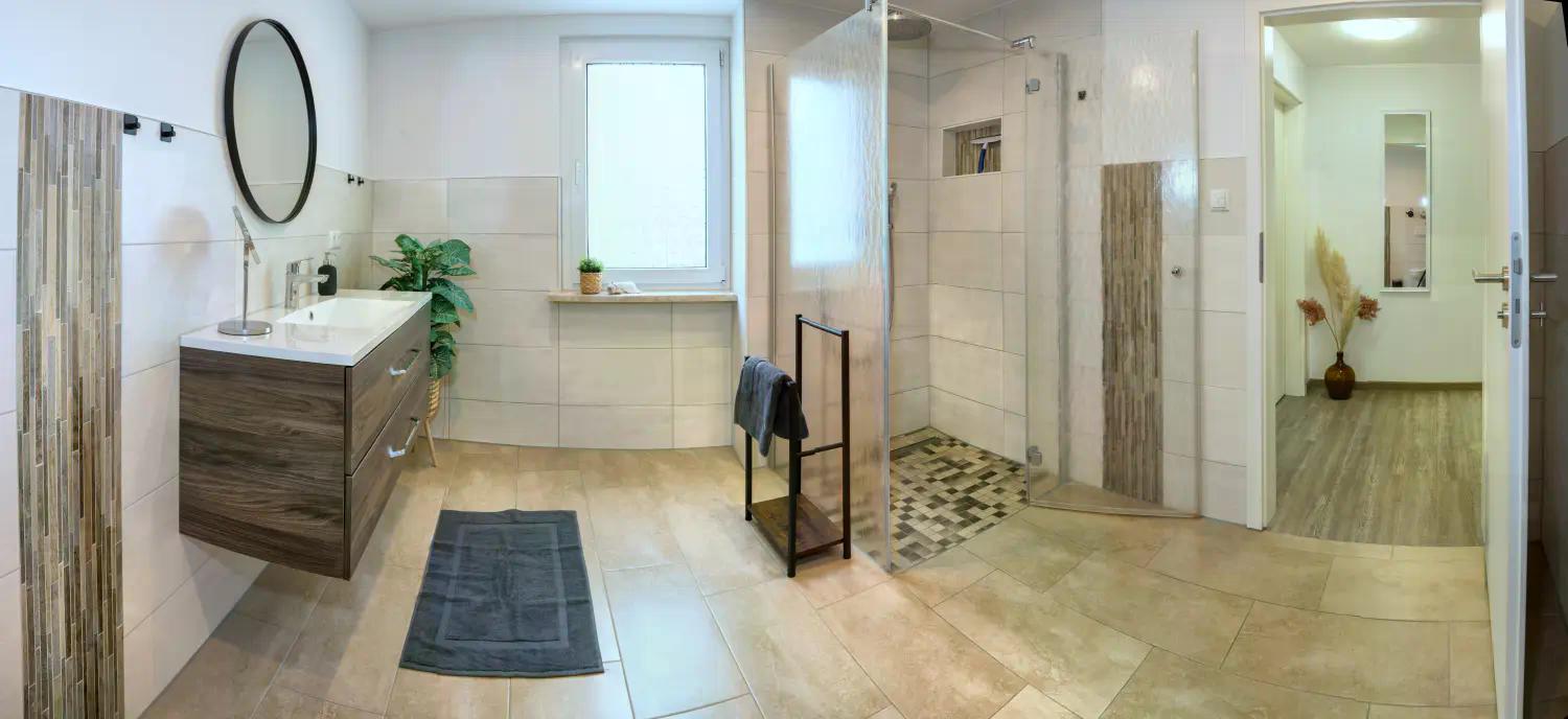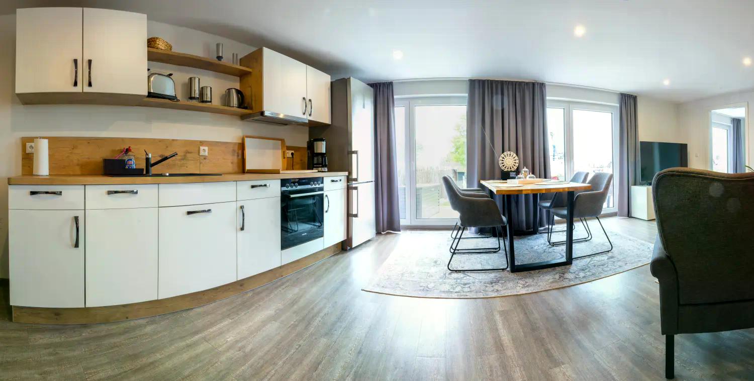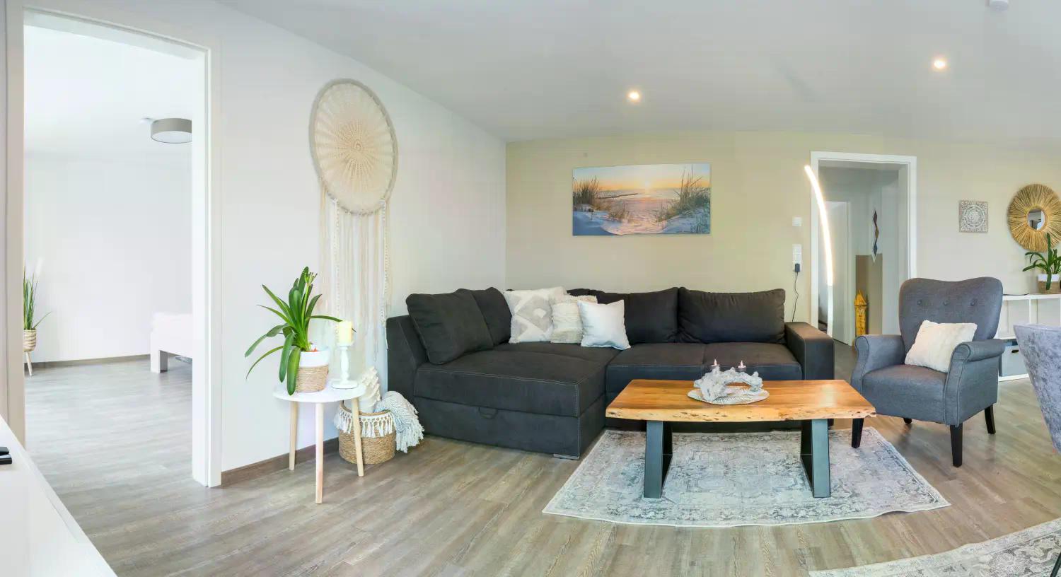 Die moderne Ausstattung lässt keine Wünsche offen: Sie genießen WLAN, einen 55″ Smart-TV, eine Soundbar mit Subwoofer sowie ein elegantes Badezimmer mit Wellnessdusche.