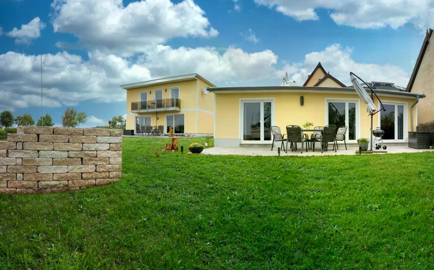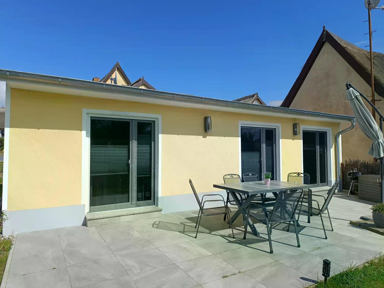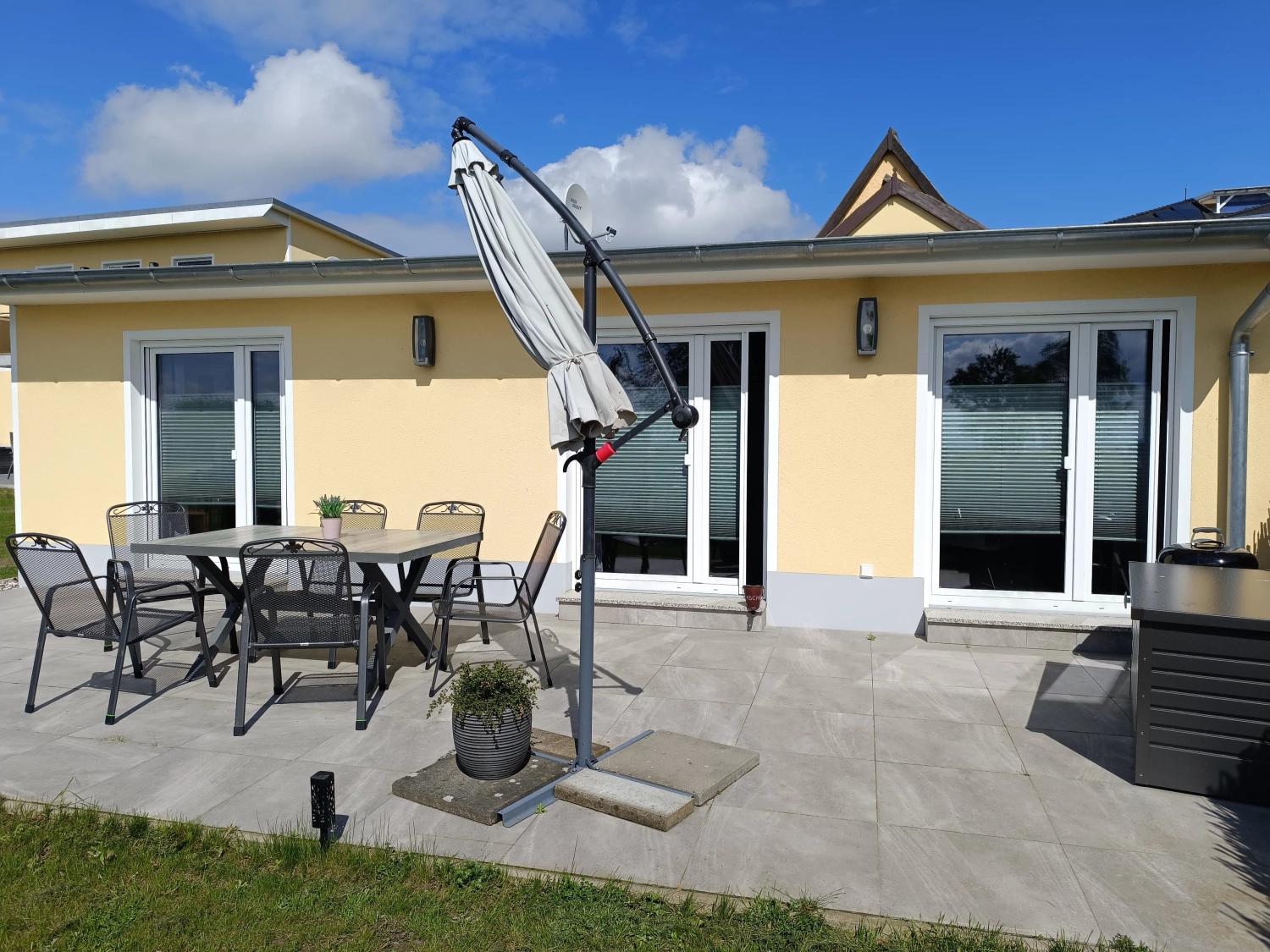 Der Wohnbereich öffnet sich zur sonnigen Terrasse, ausgestattet mit Gartenmöbeln, Sonnenschirm und einem Weber-Kugelgrill – direkt mit Blick aufs Achterwasser. Ein perfekter Ort für entspannte Urlaubsstunden am Wasser.